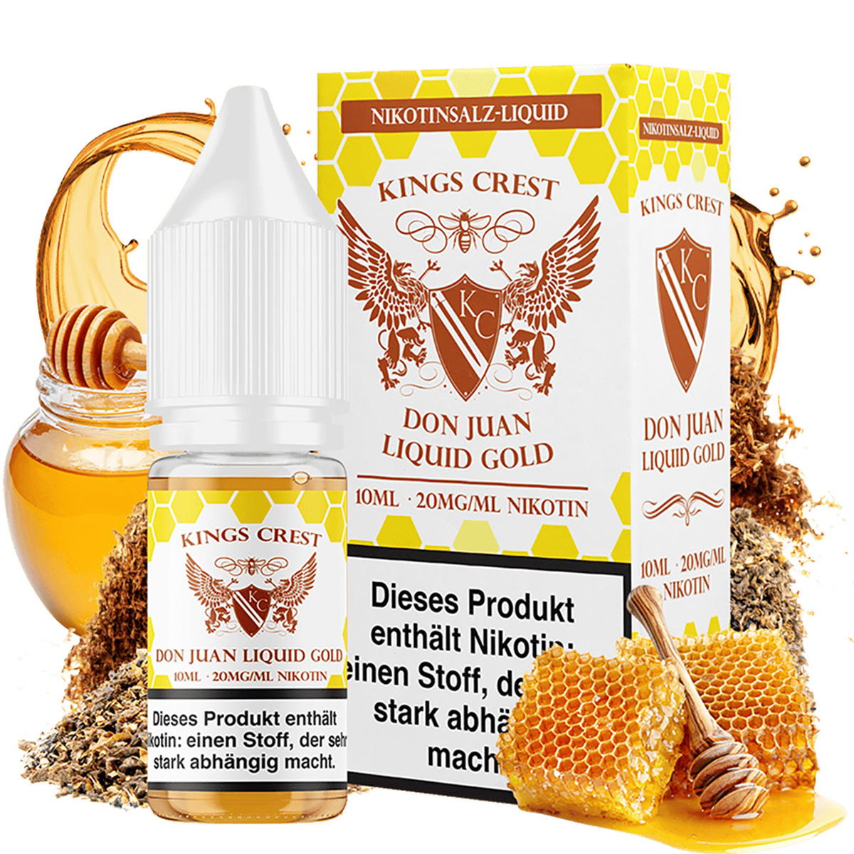 - Kings Crest Don Juan Liquid Gold NicSalt Liquid: Tabak & Honig – aromatisch, warm & elegant.